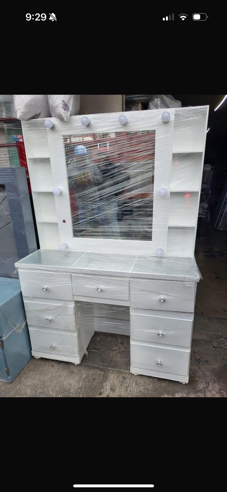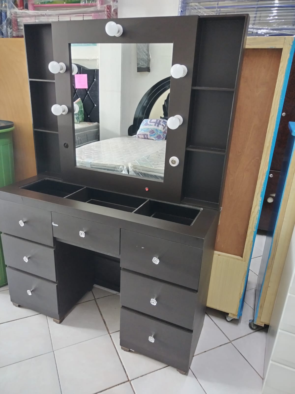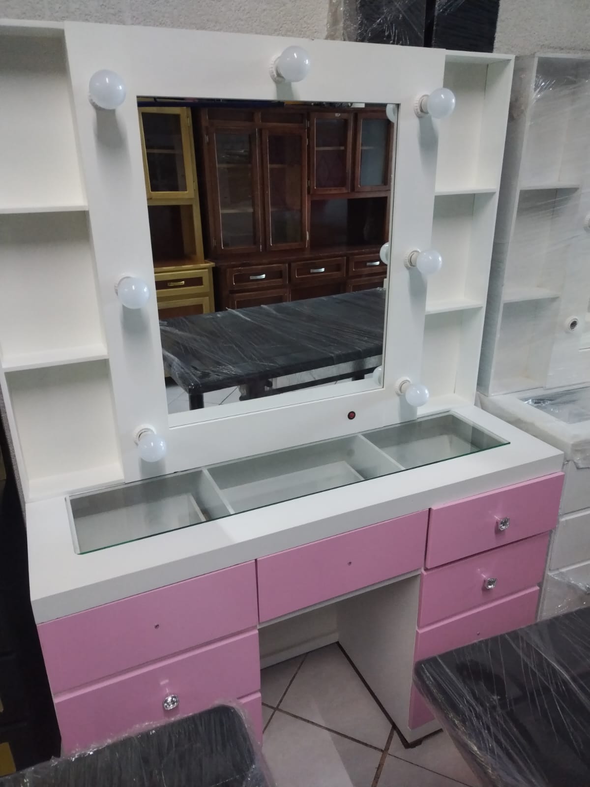 Tocador moderno con repisa integrada para colocar maquillaje, perfumes o decoración. Ideal para espacios contemporáneos.