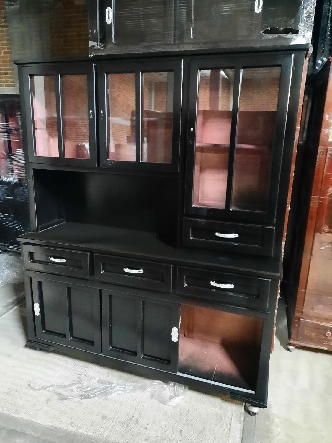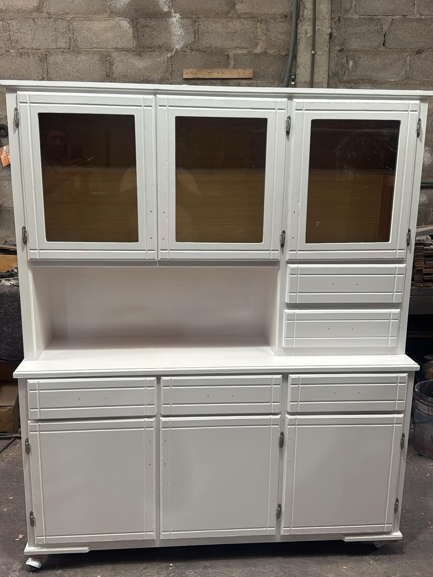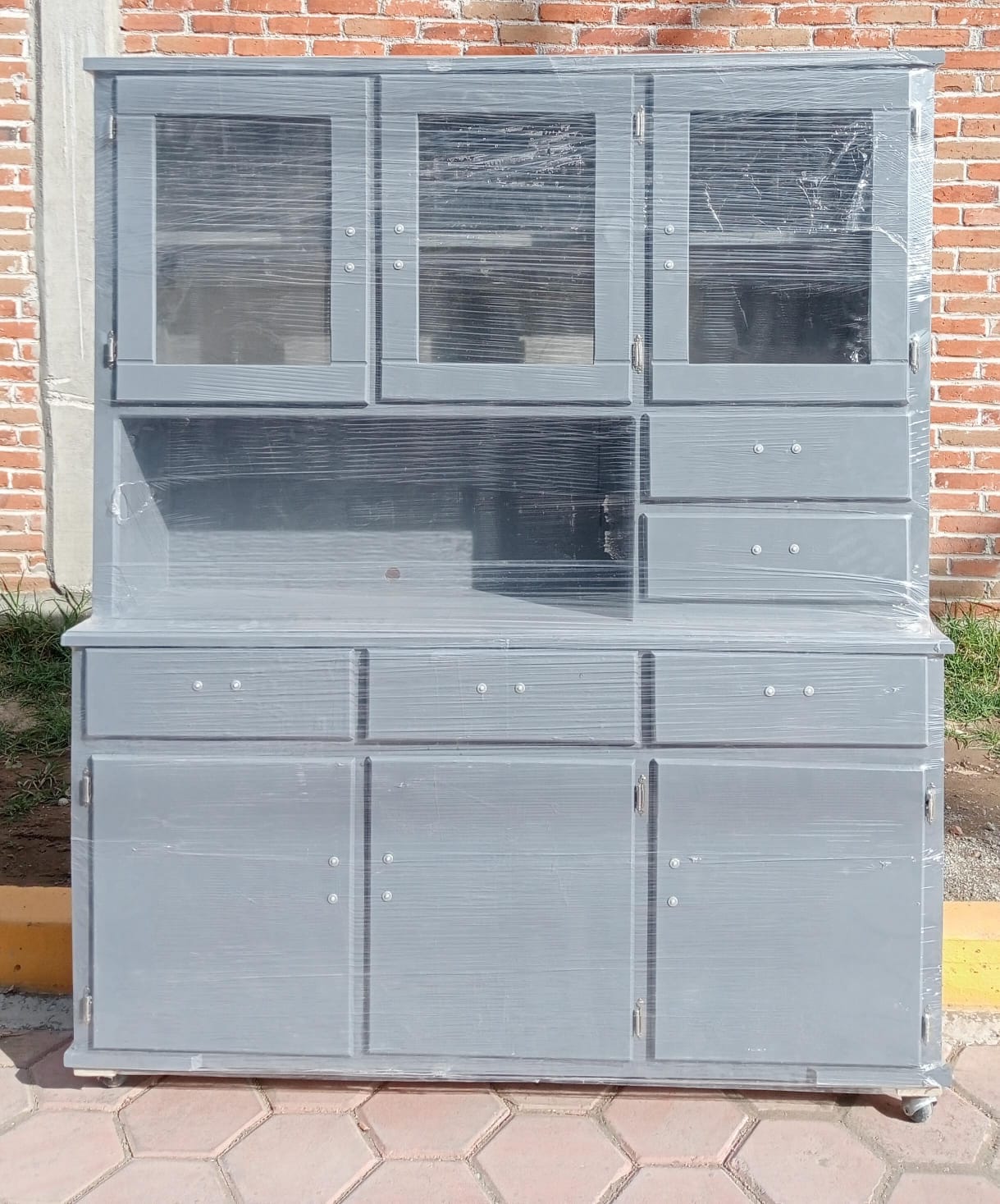 Diseño práctico para cocina con espacio para microondas, alacena y vitrina. Ideal para optimizar espacios.